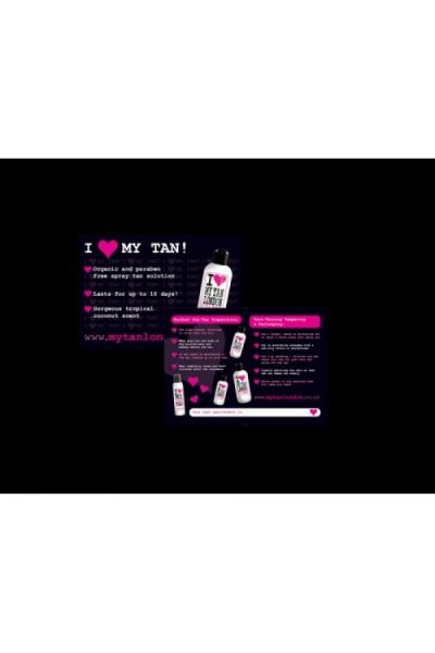 These double-sided silky A5 information leaflets are great as marketing tools to inform your clients about the service that you offer (with organic content and 100% paraben-free), and also to give them the best advice about how to prepare for and maintain their MyTan London tan.